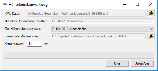 - Wenn in der XML-Datei ein Höhen-CRS eingetragen wurde, kann dann im Dialog des Höhenkorrekturwerkzeugs das Ziel-Höhen-CRS ausgewählt werden. Ist kein Höhen-CRS in der Datei enthalten, kann auch kein Ziel-CRS ausgewählt werden. Die Auswahl einer Steuerdatei für die XML-Felder wurde im Dialog ermöglicht, um bei Anpassungen des XML-Formats ggf. eine Auswahl der korrekten Steuerdatei zu ermöglichen. Da aktuell nur eine Steuerdatei vorliegt, muss hier vom Anwender keine Auswahl vorgenommen werden. Nach der Angabe des Korrekturwertes (ganzzahlige [mm]) kann die Korrektur der XML-Datei gestartet werden. Die Eingabe in [mm] wurde analog zum Höhenkorrektur-Tool des GEO TOP gewählt.