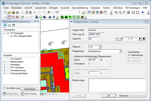Das AS Frei stellt einfache Funktionen für die Themenplandarstellung und Fachdatennutzung der Freianlagen-Daten zur Verfügung: es werden Funktionen zur Präsentation der Freianlagen-Themenpläne, zur Anzeige von Sachdaten zu Freianlagen-Objekten, zur Sachdatensuche und zur Sachdatenauswertung (Berichterstellung) zur Verfügung gestellt.